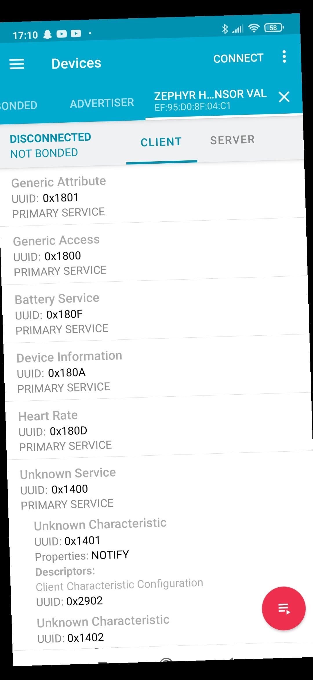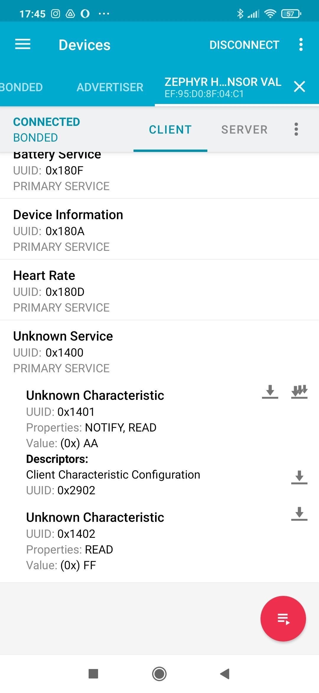 Nous avons réussi à afficher ces caractéristiques sur nos smartphone via l'application NRF-Connect sur android comme le montre ces deux screens :